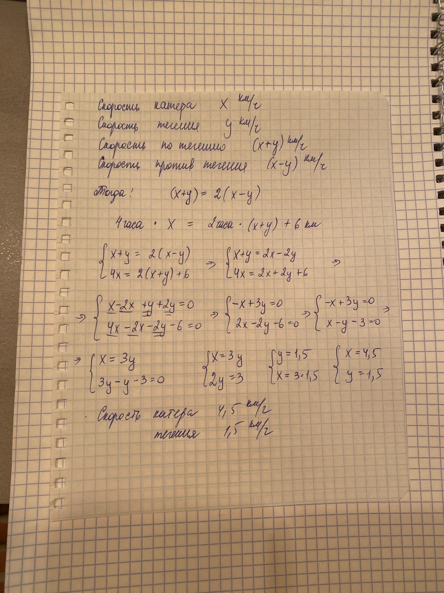 Прогулочный катер движется по течению реки в два раза быстрее, чем против течения. В стоячей воде за 4 часа катер проходит на 6 км больше, чем за 2 часа по течению. Найдите скорость катера в стоячей воде и скорость течения.