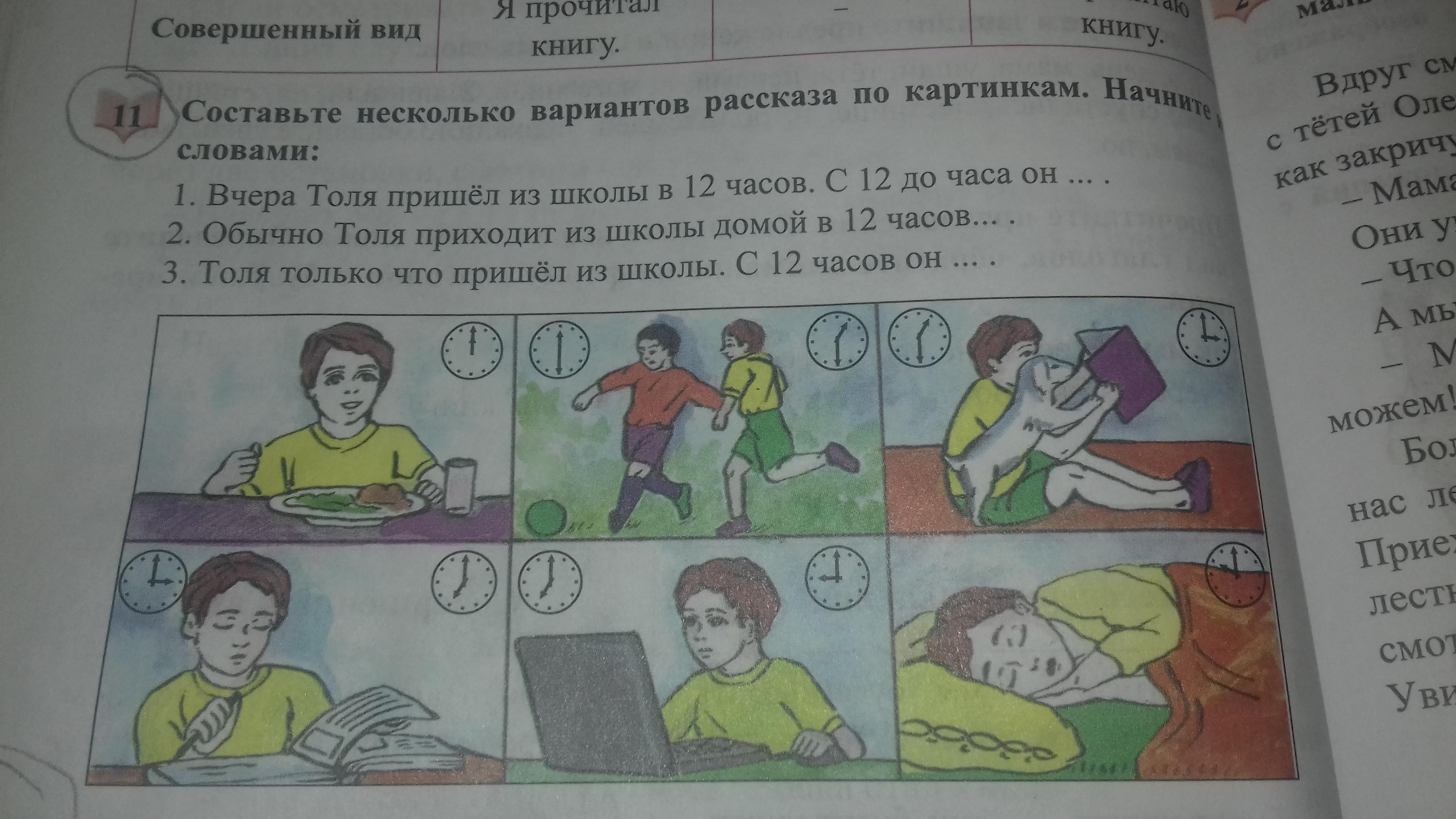 Вчера Толя пришёл из школы в 12 часов. С 12 до часа он ... 2. о быч- но Толя приходит домой в 12 часов ... 3. Толя только что ...