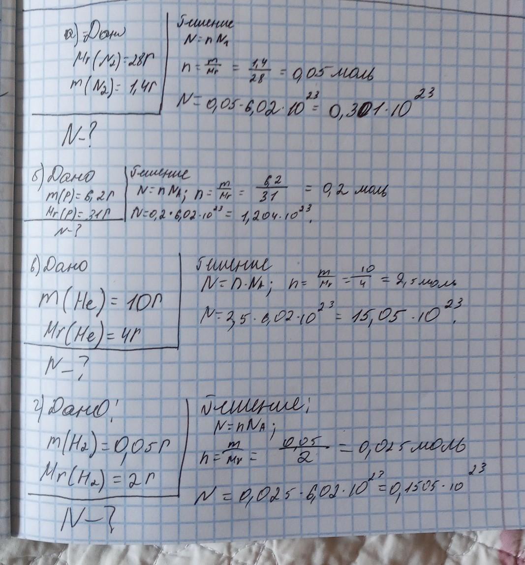 Определите число атомов: a) в 1,4 граммах азота N; б) в 6,2 г фосфора P; в) в 10 г гелия He; г) в 0,05 г водорода H.