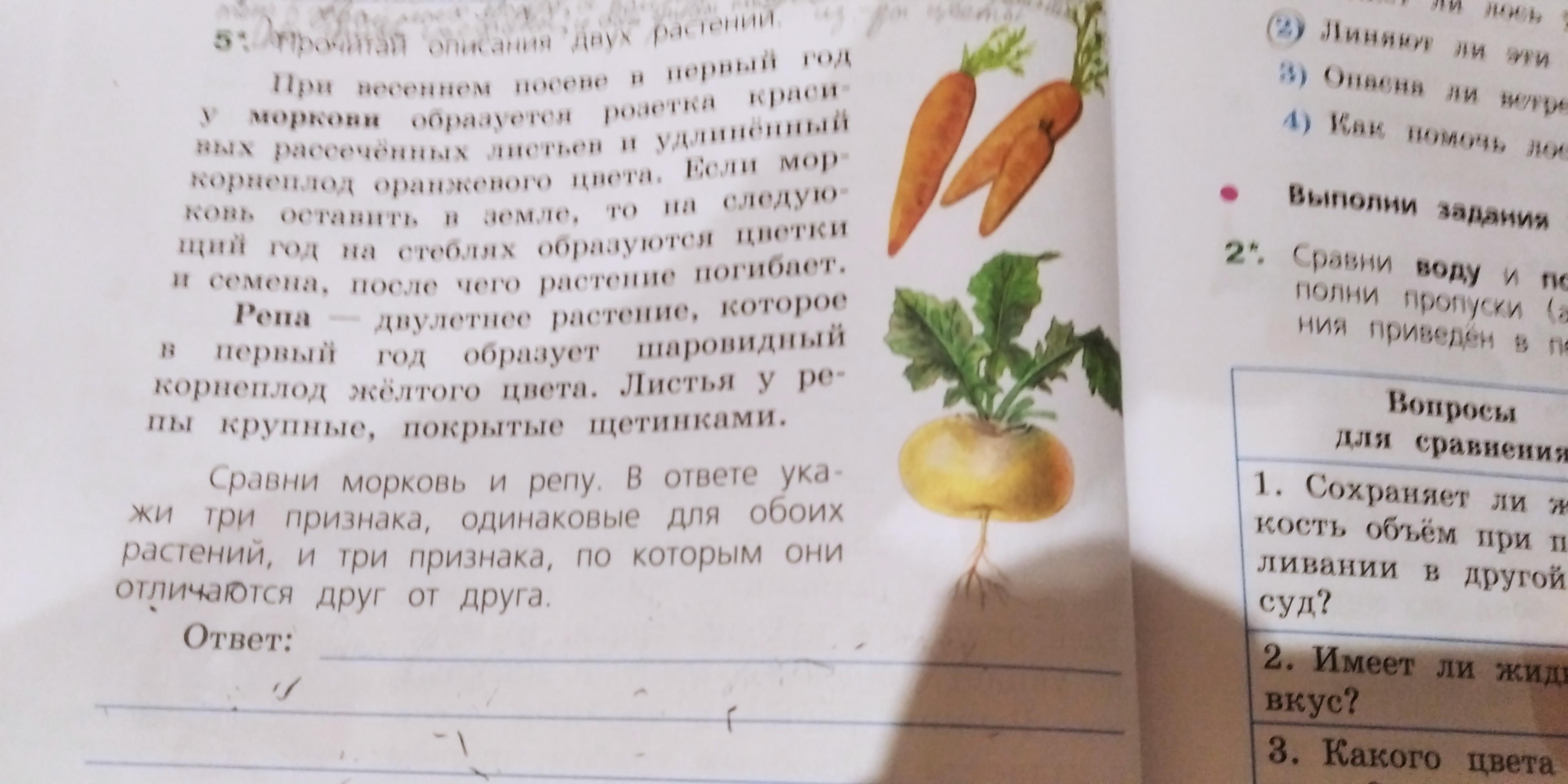 Чем морковь и репа схожи: 1. есть корнеплод, листья. 2.и то, и то могут образовать цветки и семена. 3.оба овоща (растения) в первый год образуют корнеплод. Различия 1.форма,цвет овощей. 2.разные листья :у моркови образуется розетка красивых рассеченных листьев;листья у репы крупные, покрытые щетинками. 3.не могу найти, прости
