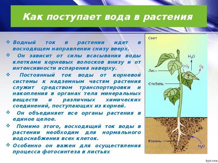 Вода в растениях движется снизу вверх .Так как она всасывается из почвы благодаря корню.