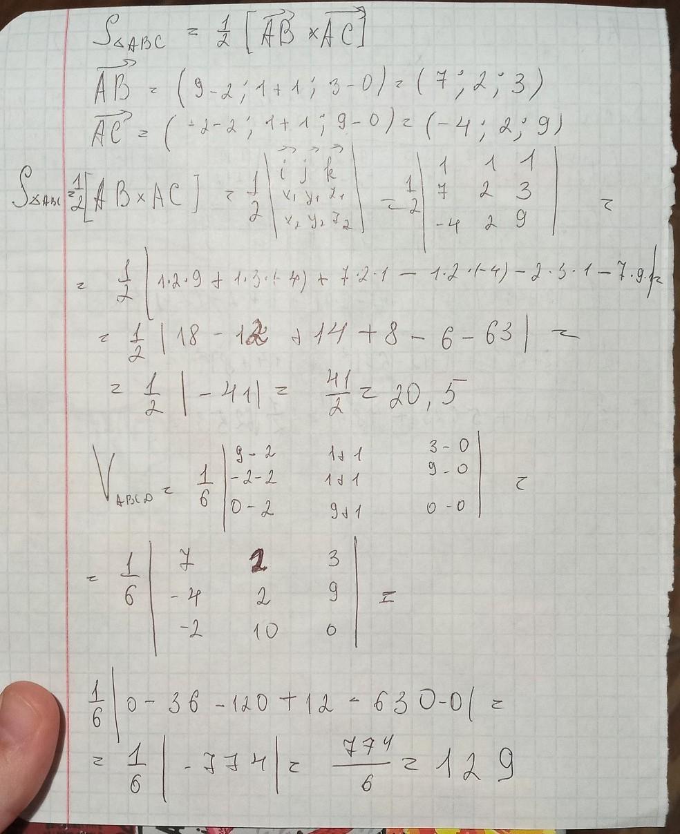Обчисліть площу грані ABC і об’єм піраміди, вершини якої містяться в точках A (2;-1;0); B(9;1;3) C(-2;1;9) ,D(0; 9; 0),