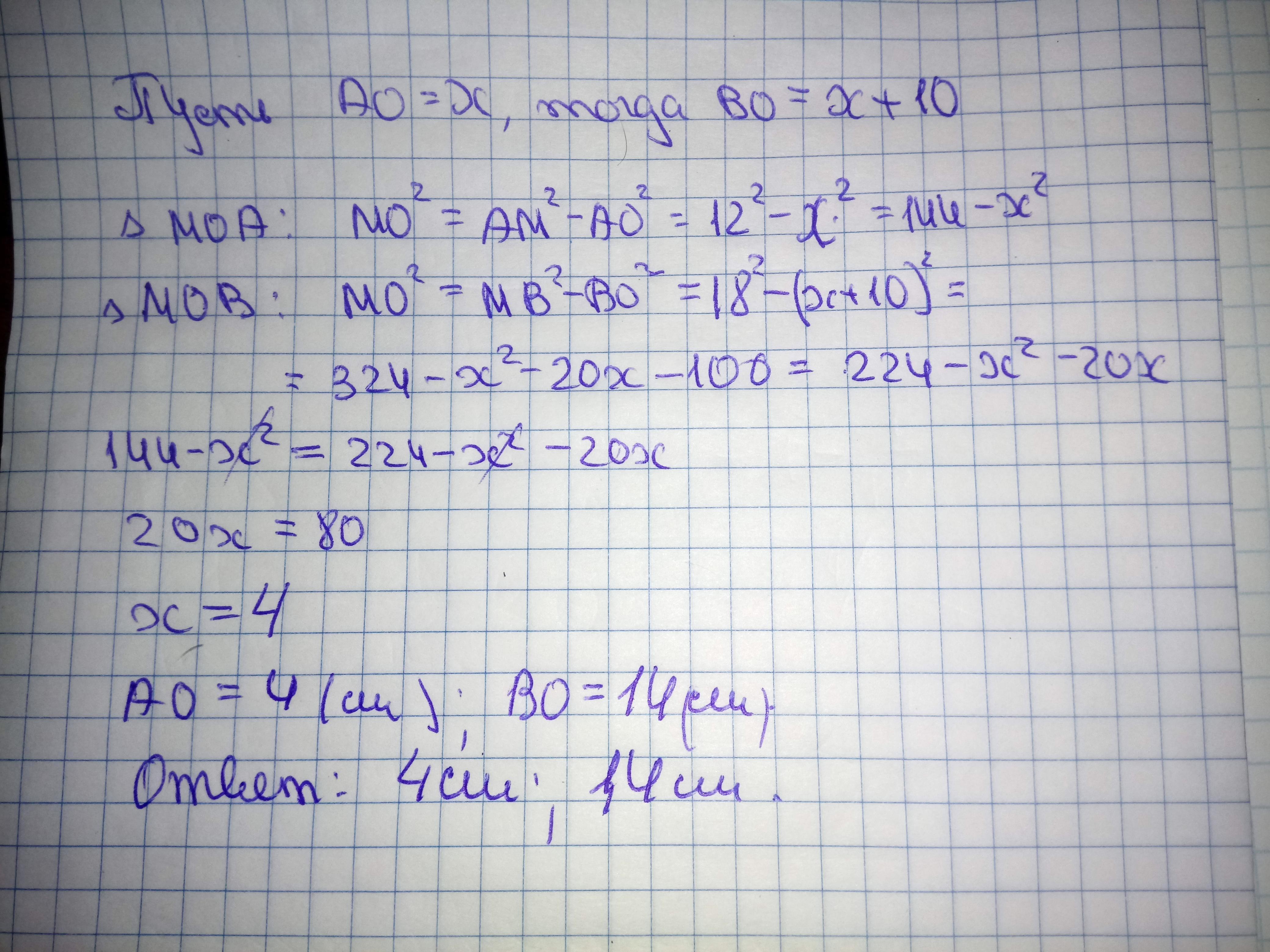 ОМ²=18²-(АО+10)² из Δ ВМО; приравняем: