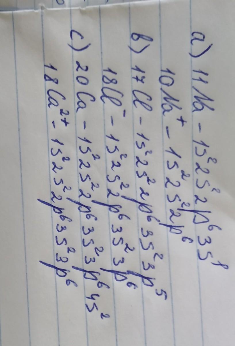 а) 11Na – 1s²2s²2p⁶3s¹; 10Na+ – 1s²2s²2p⁶; в)17Cl – 1s²2s²2p⁶3s²3p⁵; 18Cl- –1s²2s²2p⁶3s²3p⁶; c) 20Ca – 1s²2s²2p⁶3s²3p⁶4s²; 18Ca²+ – 1s²2s²2p⁶3s²3p⁶