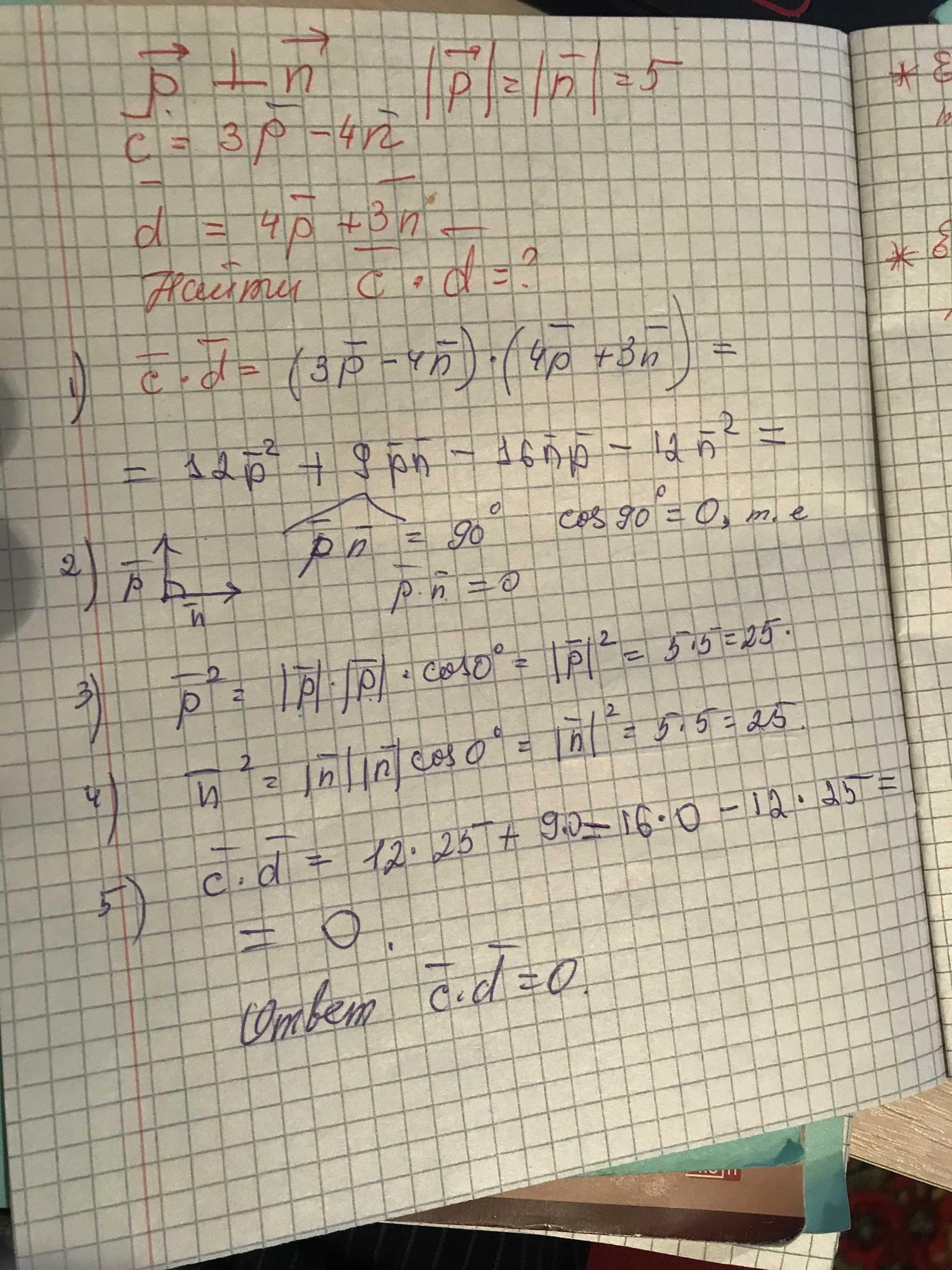 Векторы p→ и n→ взаимно перпендикулярны, они одинаковой длины: 5 см. Определи скалярное произведение векторов c→ и d→, которые выражены следующим образом: