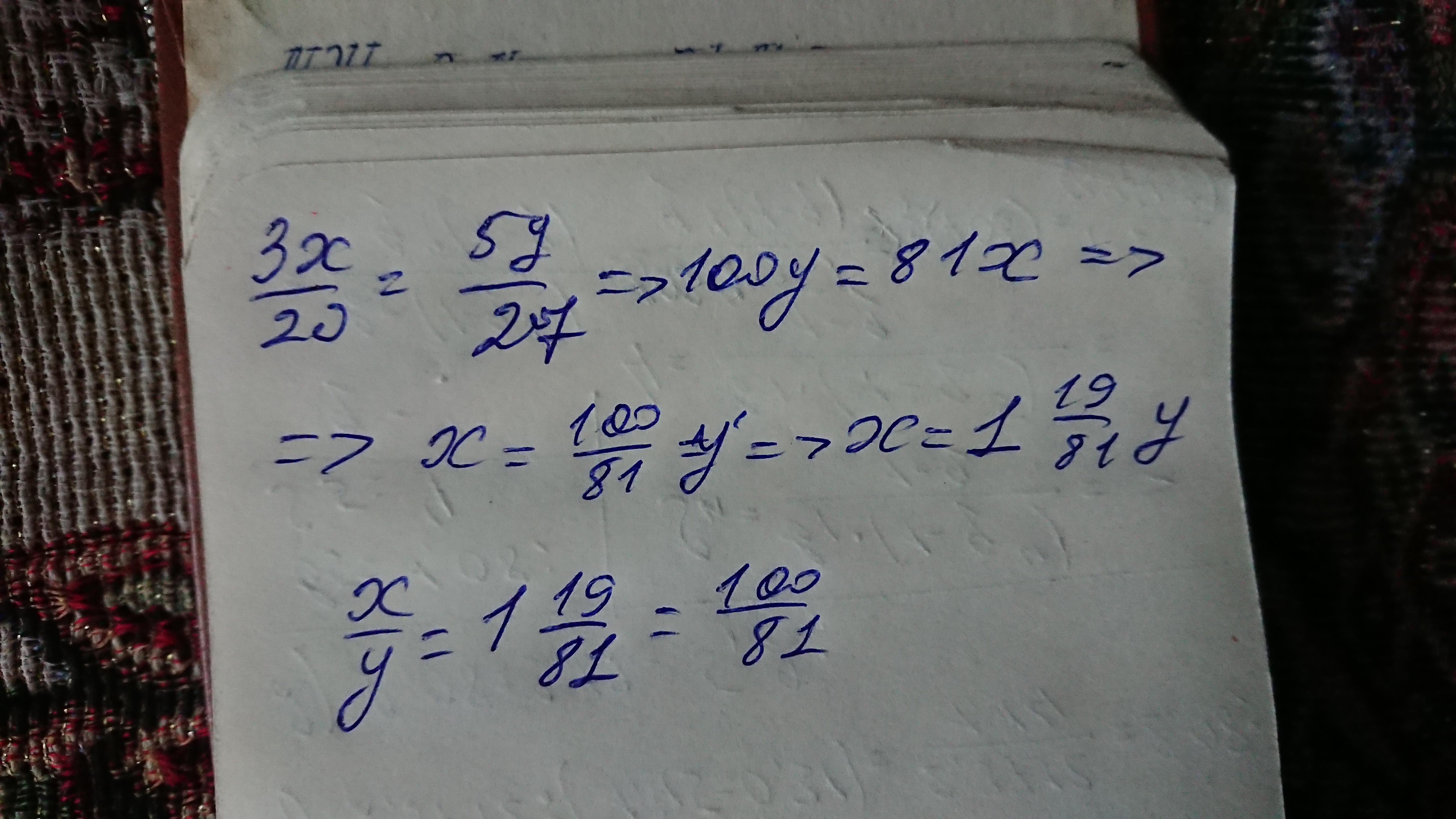 Найти отношение x: у из выражения 3x : 20 = 5у : 27.