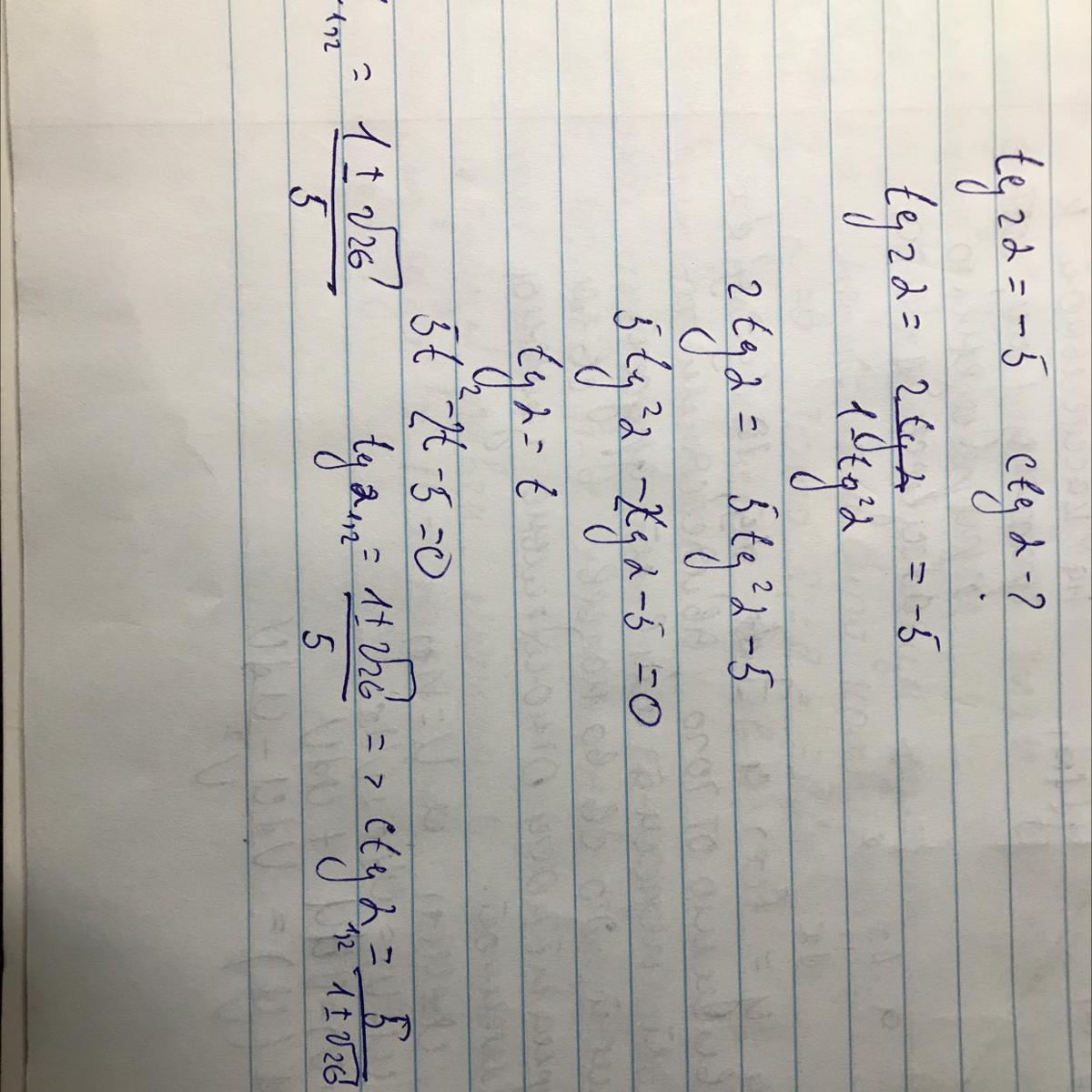 Помогите пожалуйста решить. Известно, что тангенс 2а равен - 5. Нужно найти котангенс а