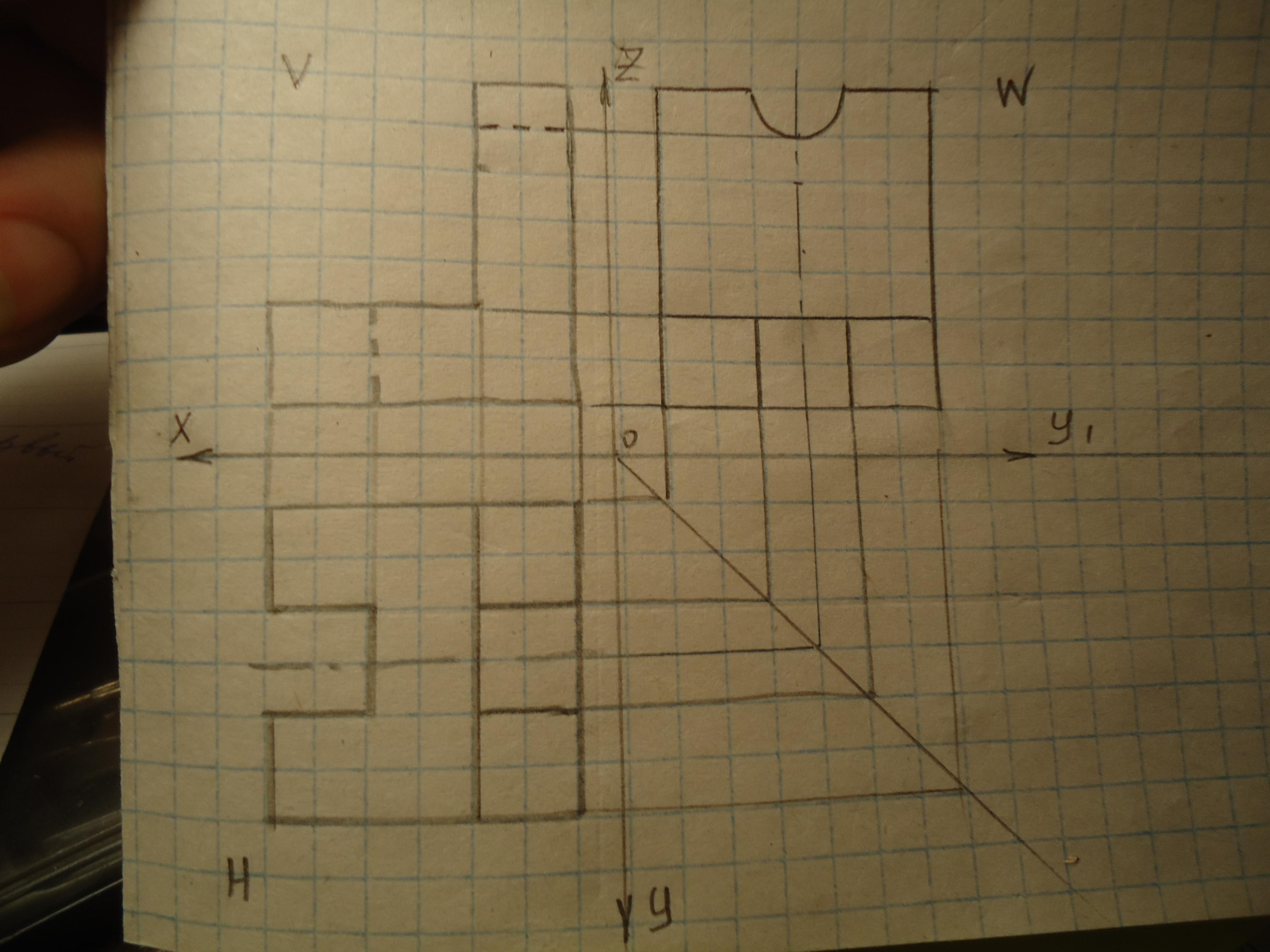 Чертёж надо выполнить с произвольными размерами, сохраняя пропорции на глаз. Линии проекционной связи см. на фото.