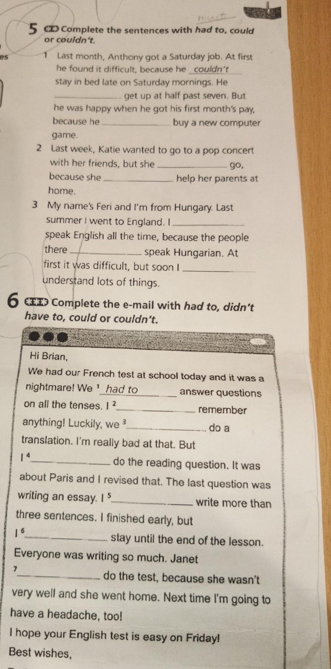 Ex5 - 1)had to;could; 2)couldn't; had to; 3)had to; couldn't ; could