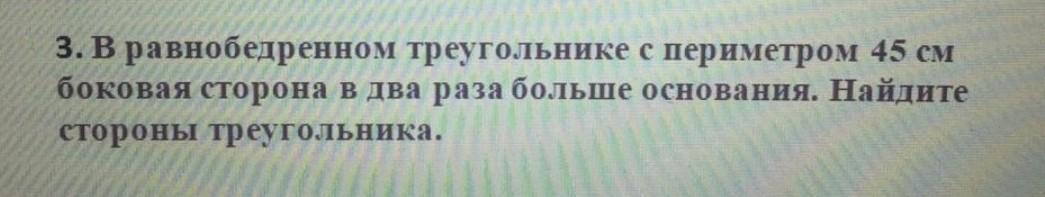 3. В равнобедренном треугольнике с периметром 45 см боковая сторона в два раза больше основания. Найдите стороны треугольника.