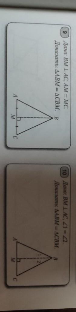10) Равны по стороне и двум прилегающим углам: ВМ- общая, <АМВ=<СМВ=90º и <АВМ=<МВС (по условию)