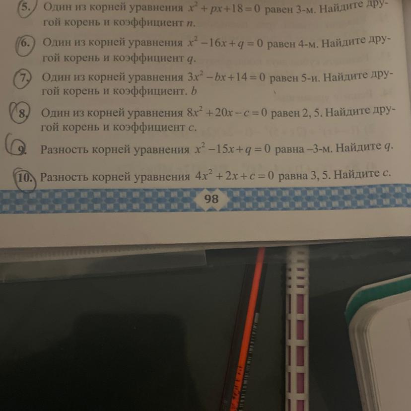7)\ \ 3x^2-bx+14=0 \ \ \ ,\ \ \ x_1=5\\\\teorema\ Vieta:\ \left\{\begin{array}{l}\ x_1+x_2=\dfrac{b}{3}\\x_1\cdot x_2=\dfrac{14}{3}\end{array}\right\ \ \left\{\begin{array}{l}\ 5+x_2=\dfrac{b}{3}\\5\cdot x_2=\dfrac{14}{3}\end{array}\right\ \ \left\{\begin{array}{l}\ x_2=\dfrac{14}{15}\\5+\dfrac{14}{15}=\dfrac{b}{3}\end{array}\right