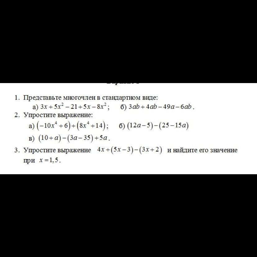 1. а) 3x + 5x^2 - 21 + 5x - 8x^2 = -3x^2 + 8x - 21