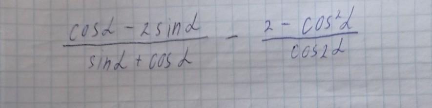 \frac{Cos\alpha-2Sin\alpha}{Sin\alpha+Cos\alpha}-\frac{2-Cos^{2}\alpha}{Cos2\alpha}=\frac{Cos\alpha-2Sin\alpha}{Sin\alpha+Cos\alpha}-\frac{2-Cos^{2}\alpha}{Cos^{2}\alpha-Sin^{2}\alpha}=\\\\=\frac{Cos\alpha-2Sin\alpha}{Sin\alpha+Cos\alpha}-\frac{2-Cos^{2}\alpha}{(Cos\alpha-Sin\alpha)(Cos\alpha+Sin\alpha)}=\frac{(Cos\alpha-2Sin\alpha)(Cos\alpha-Sin\alpha)-2+Cos^{2}\alpha}{(Cos\alpha-Sin\alpha)(Cos\alpha+Sin\alpha)}=