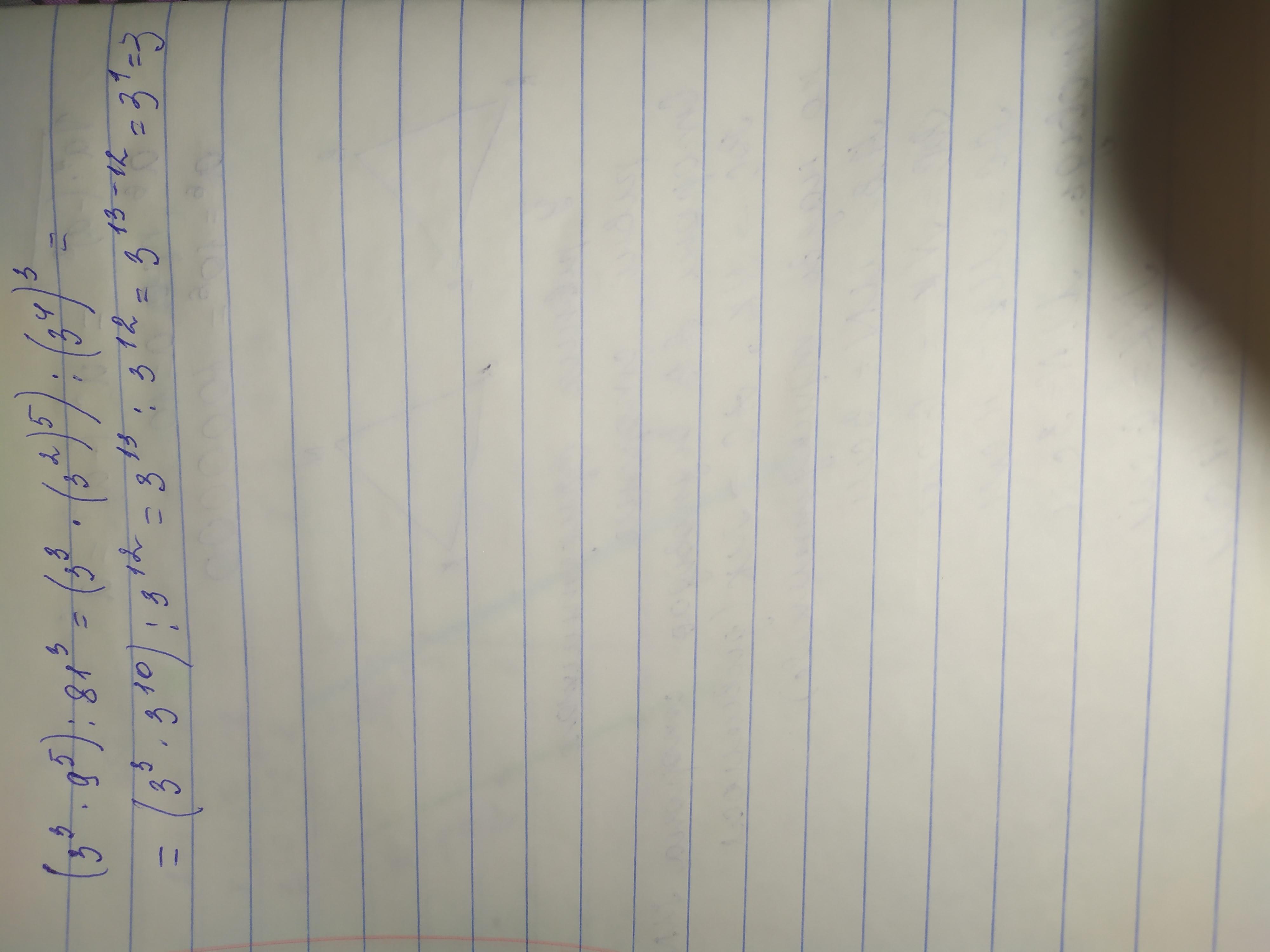 (3^3×9^5)÷81^3=(3^3×(3^2)^5)÷81^3=(3^3×3^10)÷81^3=(3^13)/(3^12)=3^13-12=3^1=3