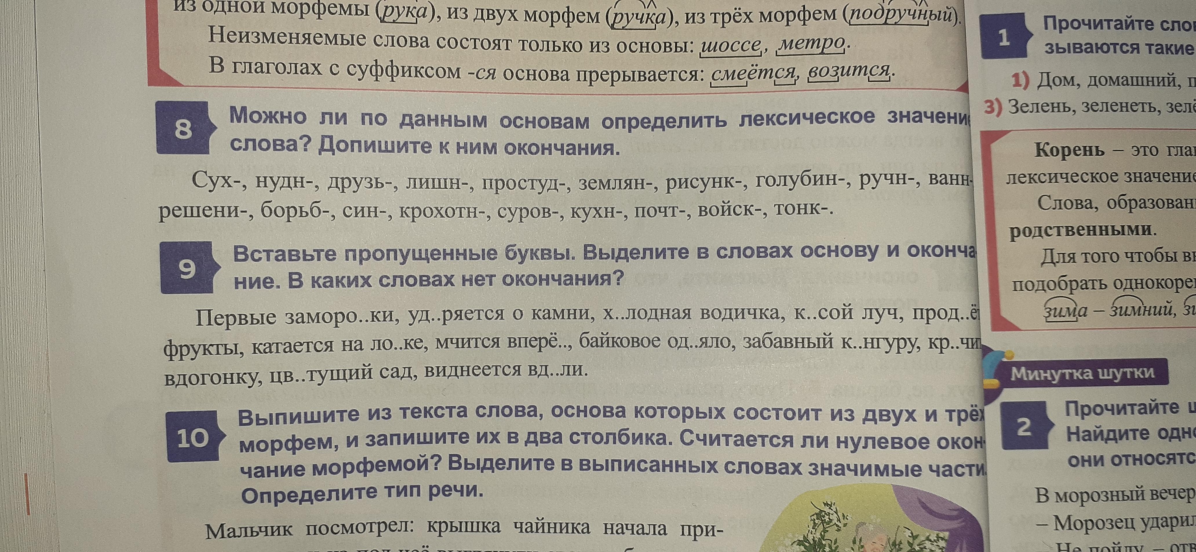 заморозки (ос. заморозк, □ и), ударяется (ос. ударя, □ ет), холодная (ос. холодн, □ ая), косой (ос. кос, □ ой), продаёт (ос. прода, □ет), лодке (ос. лодк, □ е), вперёд (ос.вперед, □ нет), одеяло (ос. одеял, □ о), кенгуру (ос. кенгуру, □ нет), кричит (ос.крич, □ ит), цветущий (ос. цветущ, □ ий), вдали (ос.вдали, □ нет).