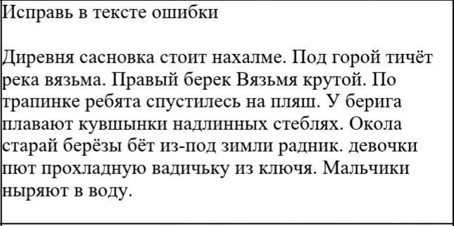 Деревня Сосновка стоит на холме. Под горой течёт река Вязьма. Правый берег Вязьмы крутой. По тропинке ребята спустились на пляж. У берега плавают кувшинки на длинных стеблях. Около старой берёзы бьёт из-под земли родник. Девочка пьют прохладную водичку из ключа. Мальчики ныряют в воду.