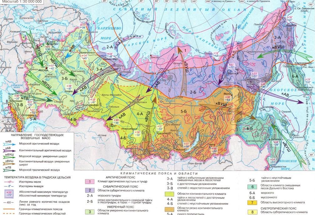 Циркуляция воздушных масс на территории России приводит к переносу влаги и тепла из одних регионов в другие.Известно, что над Россией перемещаются тропические, умеренные и арктические воздушные массы.Наибольшая часть страны находится конечно же в умеренных широтах, поэтому по сравнению с Тихим океаном, Атлантический оказывает наибольшее влияние на климат из-за господства западного переноса.