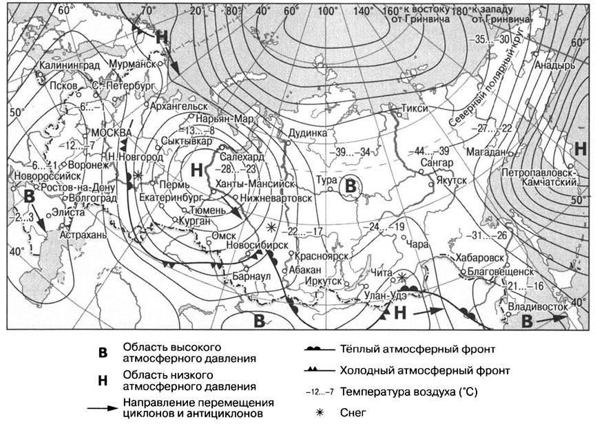 Там, где происходит соприкосновение разных по свойствам ВМ, образуются атмосферные фронты.Существует два атмосферных фронта: полярный и арктический. Арктический атмосферный фронт больше всего господствует над северными районами России, а полярный юнее границ России.
