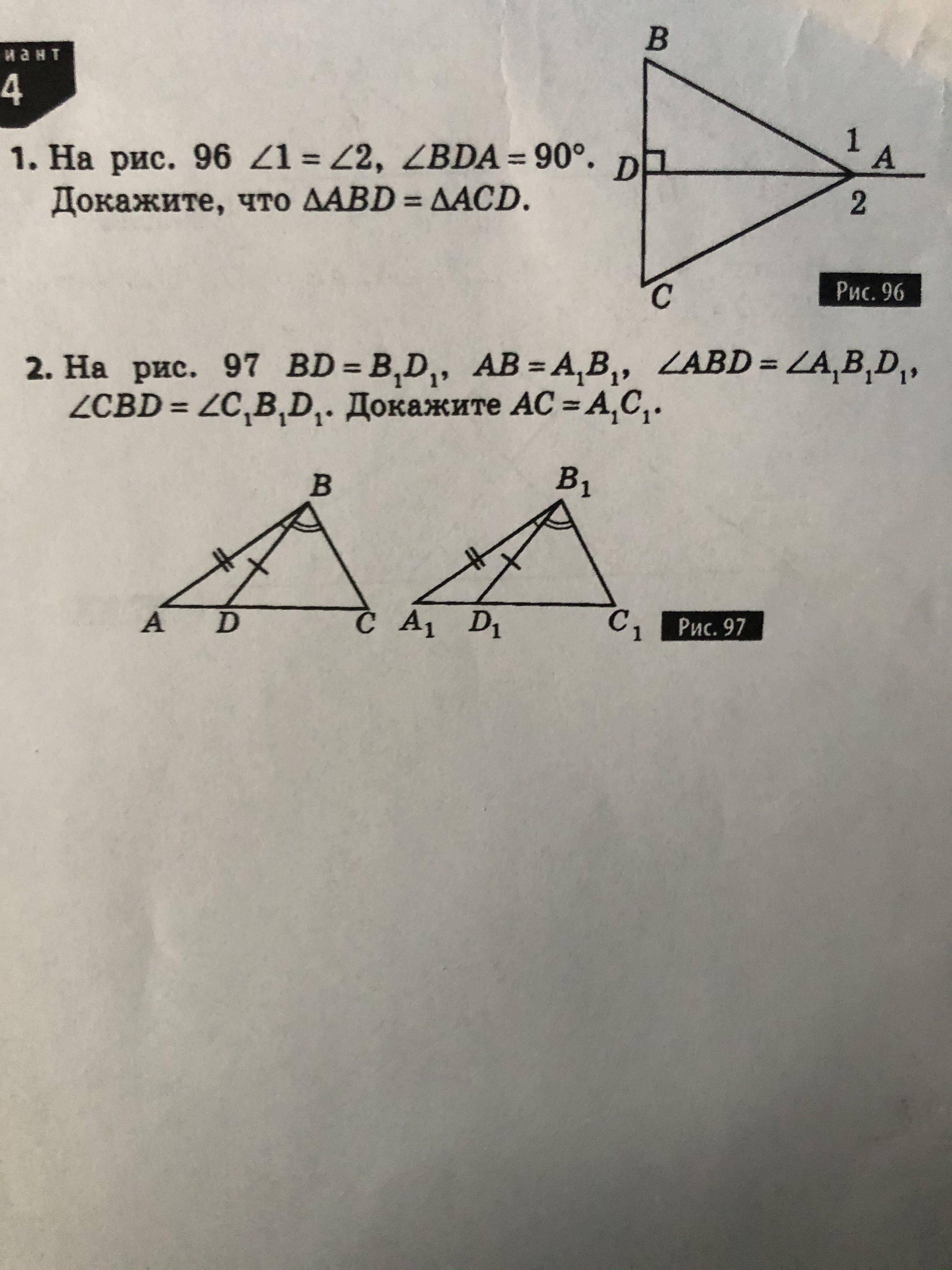 Треугольники ΔABD=ΔA1B1D1 равны по двум сторонам и углом между ними (AB=A1B1, BD=B1D1, ∠ABD=∠A1B1D1 по условию)