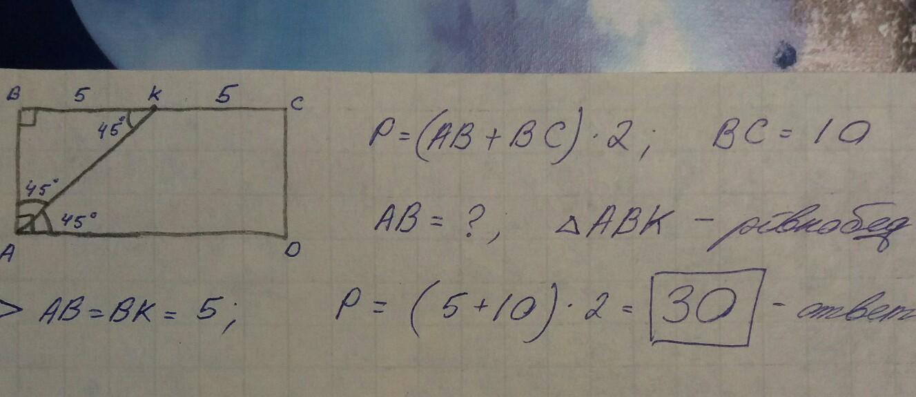 Бісектриса кута прямокутника ділить його сторону на дві частини, кожна з яких дорівнює 5 см. Знайдіть периметр прямокутника можно с картинкой