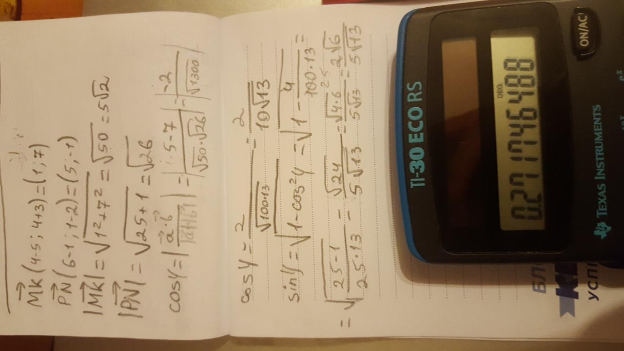 M( 5; -3), N(1; 2), K( 4; 4), P(6; 1). Найдите синус угла между