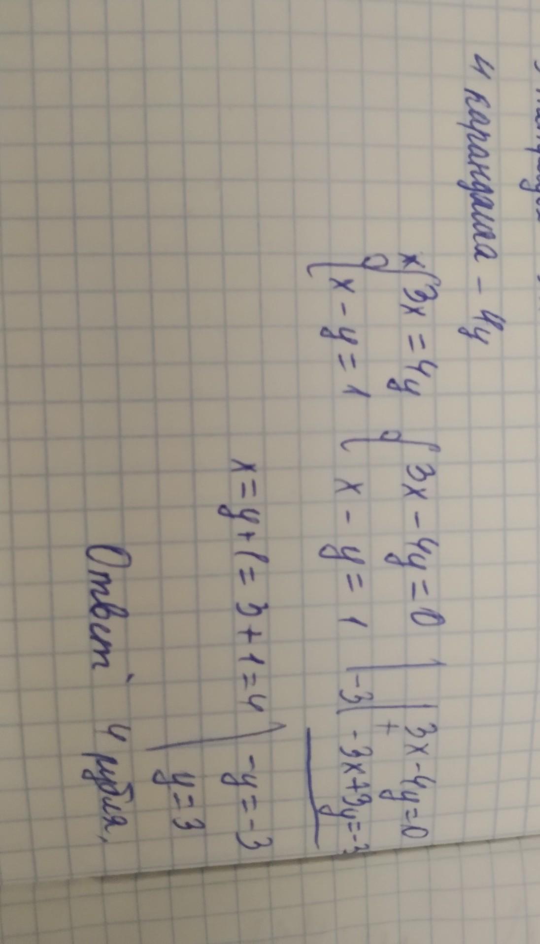 За 3 тетради заплатили столько же сколько за 4 карандаша, сколько стоит один карандаш и одна тетрадь, если известно что тетрадь дороже карандаша на 1 рубль. Сделать схематический рисунок