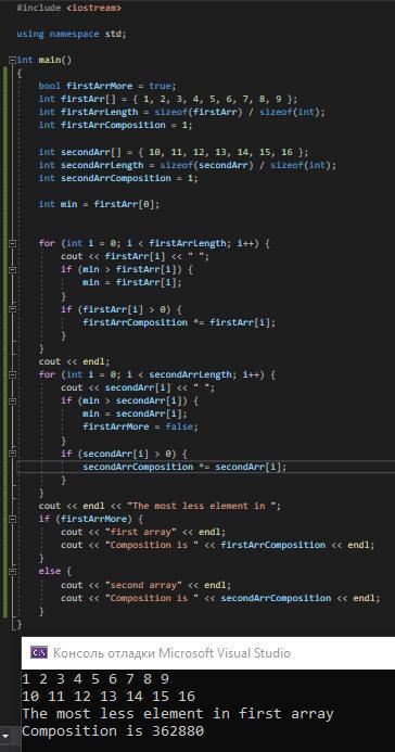 Даны два массива. Подсчитать произведение положительных элементов того массива, в котором окажется минимальный элемент. Число элементов массива не более 10. Формат элемента +-ццц. Вид распечатки результатов разработать самостоятелно.
