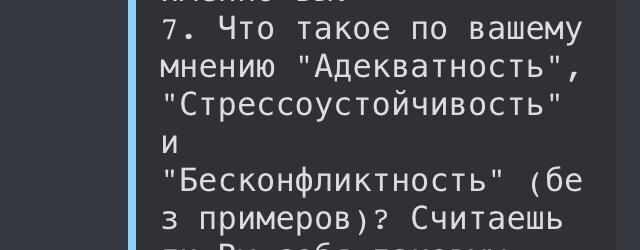 по моему мнению "адекватность","стерссоустойчивость","бесконфликтность"-это когда человек ко всему относится спокойно, это разумность, целесообразность каких-либо действий в определенной ситуации. Если человек руководствуется другими принципами и не отдает себе отчета в ситуации, его действия могут быть неадекватными
