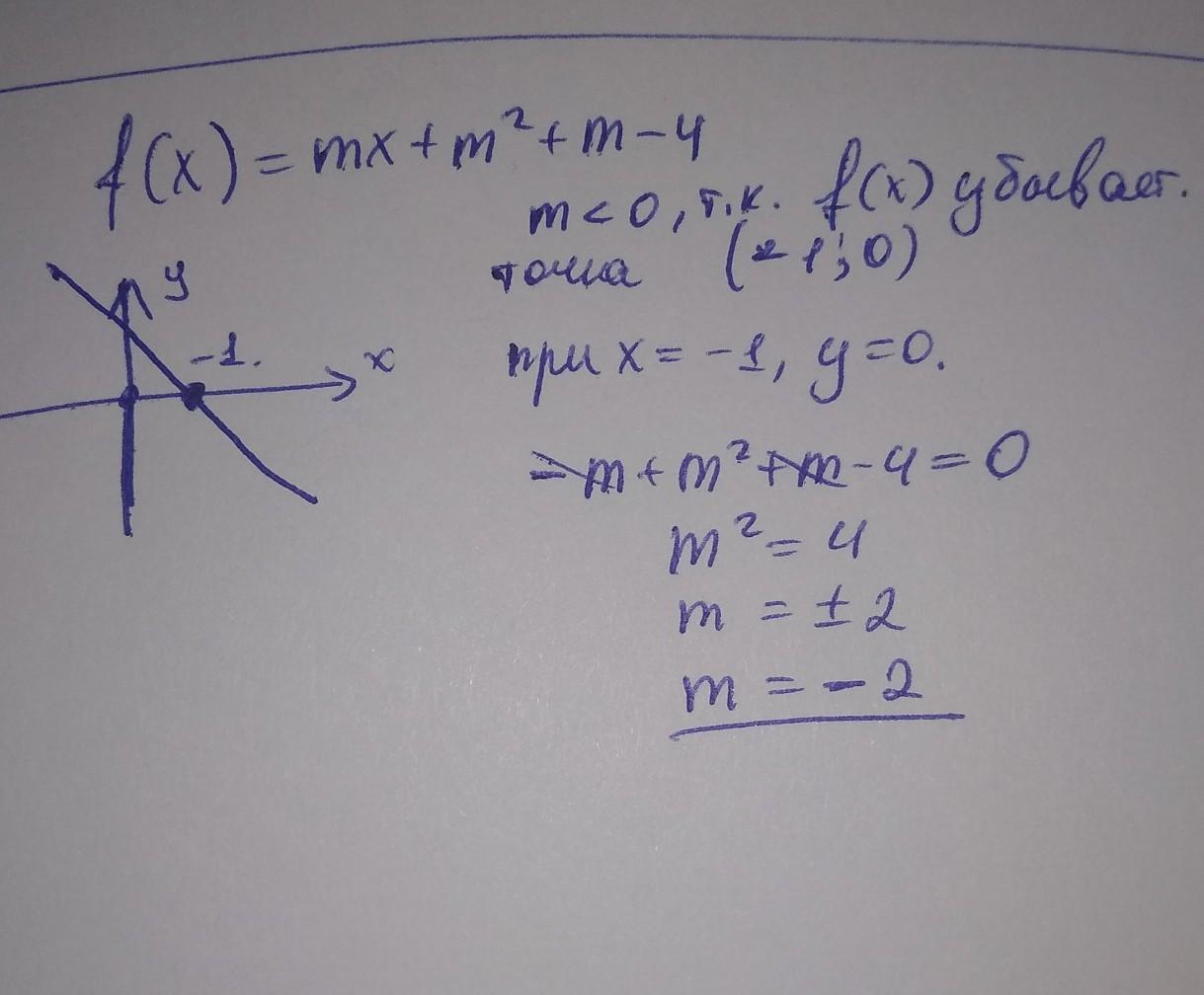 Помогите!!! Дана функция f(x)=mx+m^2+m-4.Найдите действительный значения m при которых график функций f пересекает ось Ox в точке с абсциссой x=-1 и функция f строго убывает на R