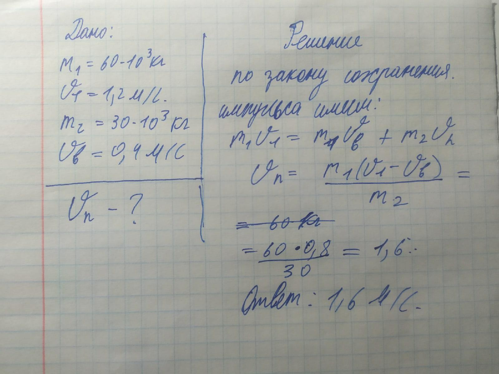 Вагон массой 60 т, движущийся со скоростью 1,2 м / с, сталкивается с неподвнжной платформой массой 30 т. Какую скорость приобрела платформа, если скорость вагона после столкновения уменьшилась до 0,4 м / с?