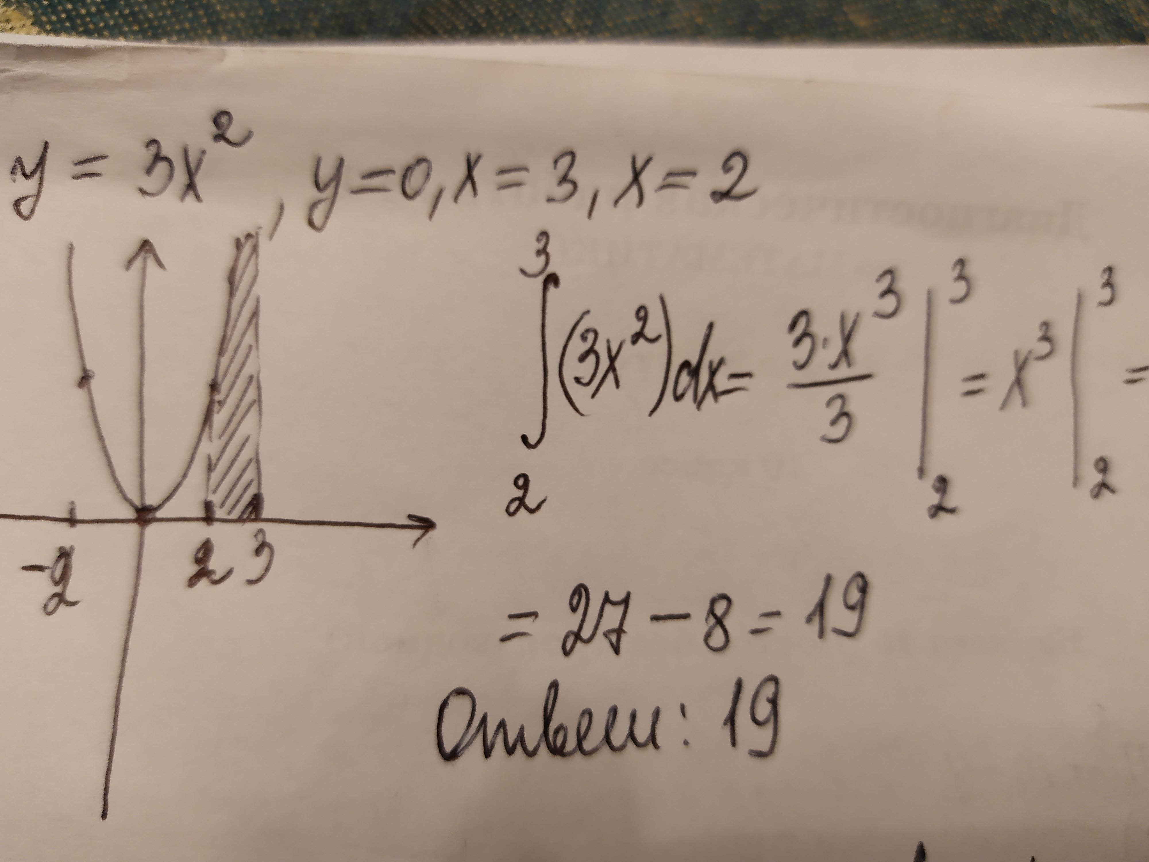 Вычислите площадь фигуры,ограниченной линиями y = 3x2 , y = 0 , x = 3 , x = 2.