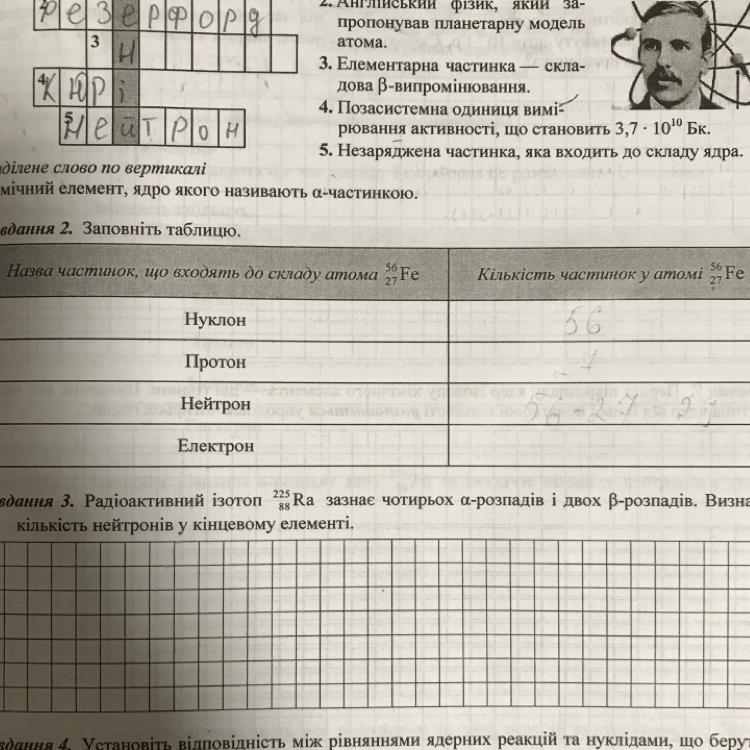 Fe. Нуклон=56 ; протон =27 ;електрон=27 ; нетрон =29 (56-27).