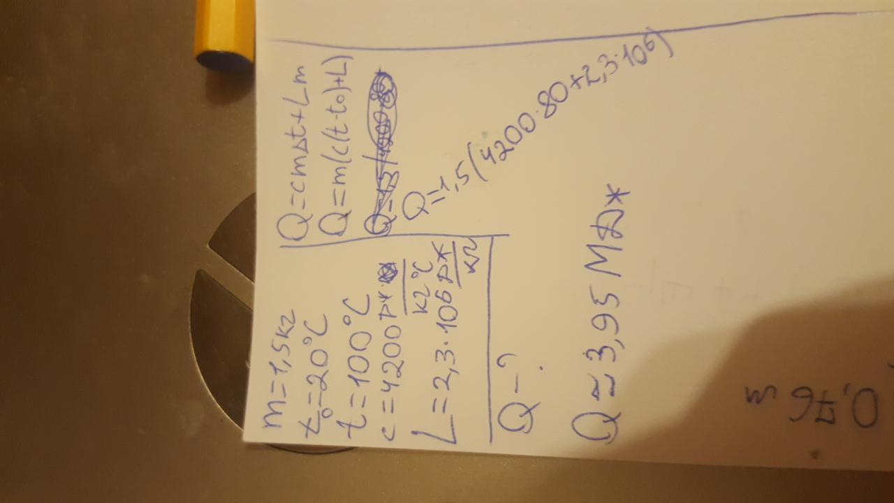 Какое количество теплоты необходимо для превращения воды массой 1,5 кг, взятой при температуре 200С в пар, имеющий температуру 1000С? Удельная теплоемкость воды