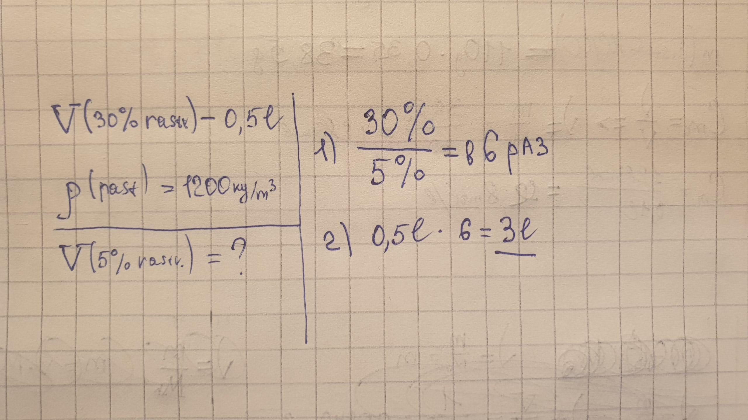 Сколько литров воды надо добавить к 0,5 литрам 30% солевого раствора с плотностью 1200 кг/м^3, чтобы получить 5% раствор?