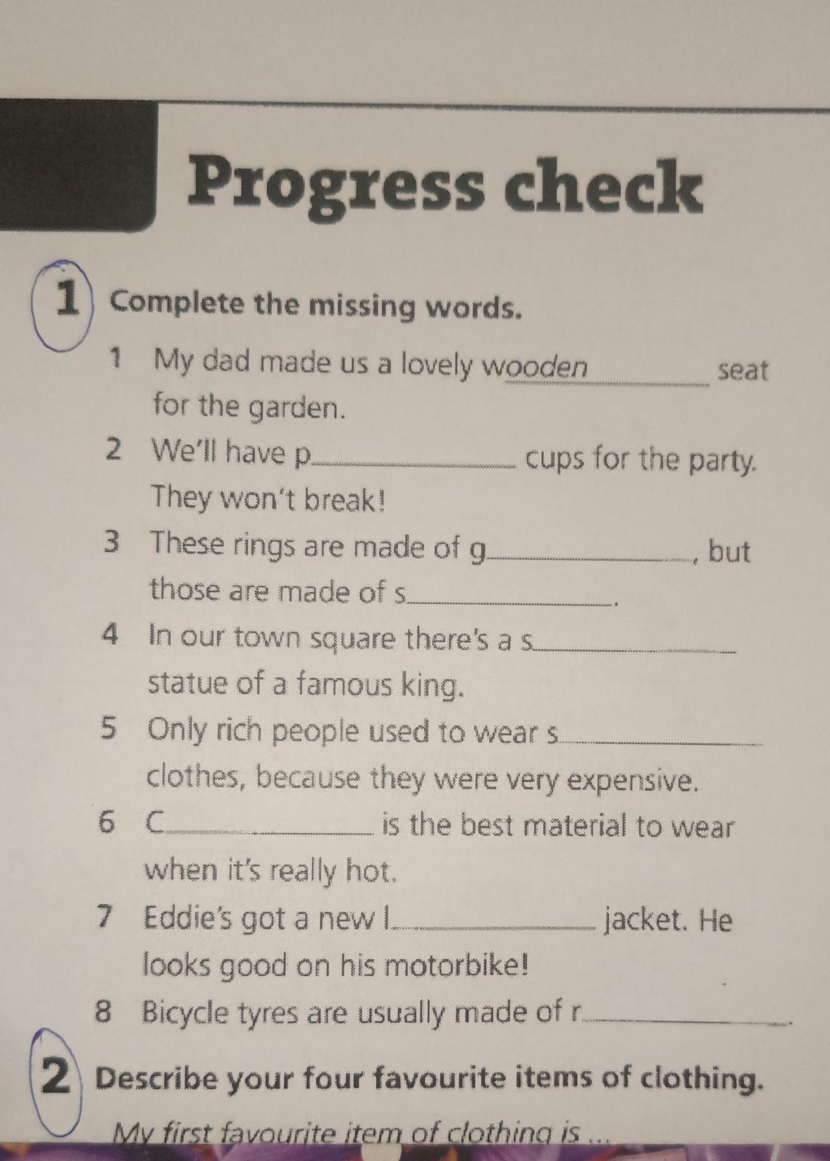 2 paper 3 gold, silver 4 stone 5 silk 6 cotton 7 leather 8 rubber