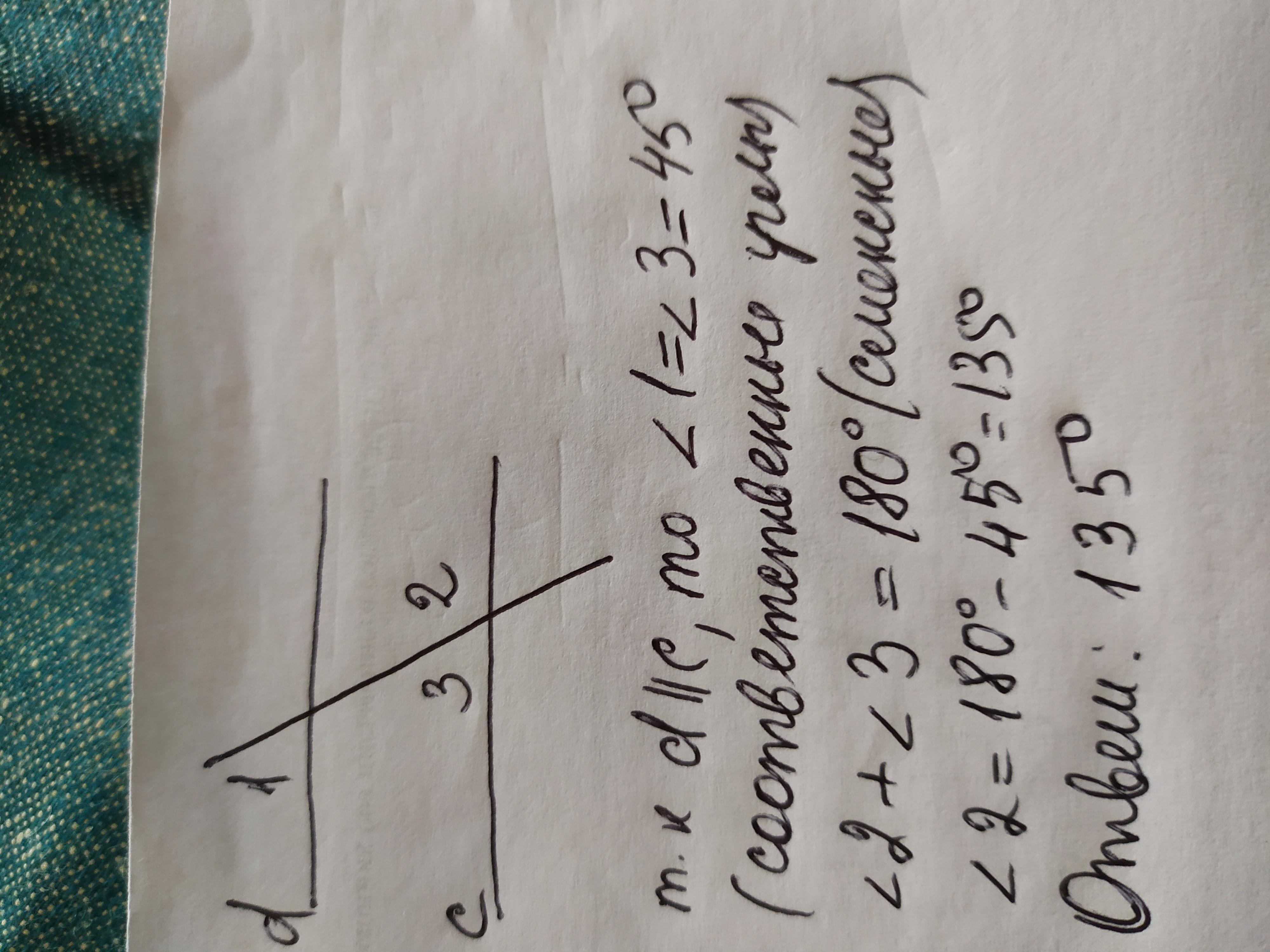 Если c параллельно d и угол 1=45 градусам, то угол 2 равен:а) 125 градусов, б) 45 градусов, в) 135 градусов, г) 155 градусов