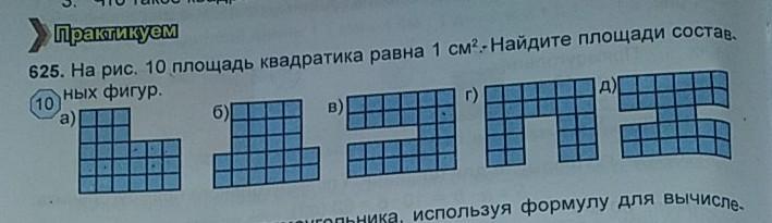посчитай сколькл квадратиков в фигуре,например в 1 номере 24 квадратика,значит площадь равна 24см квадтратных