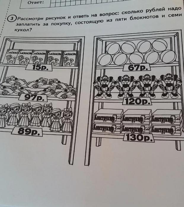 Рассмотри рисунок и ответь на вопрос сколько рублей надо заплатить за покупку состоящую из пяти блокнотов и семи кукол?