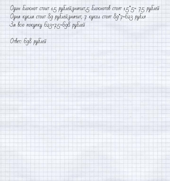 Один блокнот стоит 15 рублей, тогда 5 блокнотов стоят 15*5= 75 рублей Одна кукла стоит 89 рублей, тогда 7 кукол стоят 89*7=623 рубля. За всю покупку 623+75=698 рублей.