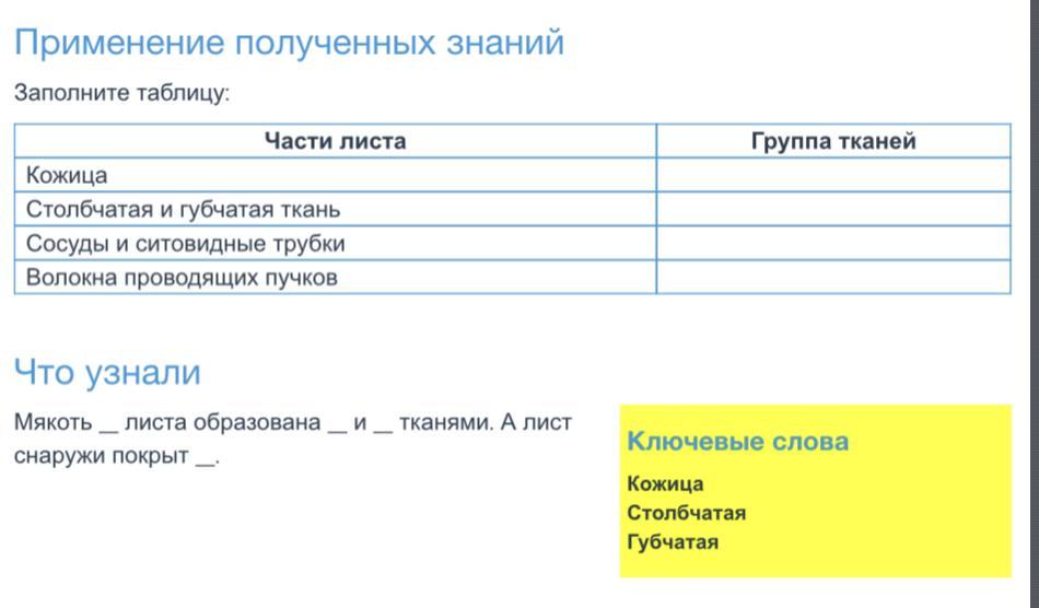 Мякоть листа образована столбчатой и губчатой тканями. А лист снаружи покрыт кожицей.