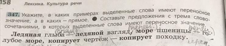 ледяная глыба(прямое знач.) - ледяной взгляд(перенос. знач.),море пшеницы(перенос. знач.) - голубое море(прямое знач.),копирует чертеж(прямое знач.) - копирует походку(перенос. знач.).