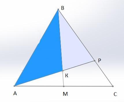 в треугольнике авс на его медиане BM отмечена точка K так, что BK:KM = 4:1 .Прямая AK пересекает сторону BC в точке P . Найдите отношение площади треугольника bkp к площади треугольника abk