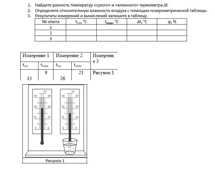 В таблице находим показание сухого термометра в 1-ом столбике. В этой строчке находим влажность под тем числом наверху, которое соответствует разнице температур сухого и влажного термометров. Там все написано. Привыкнете))
