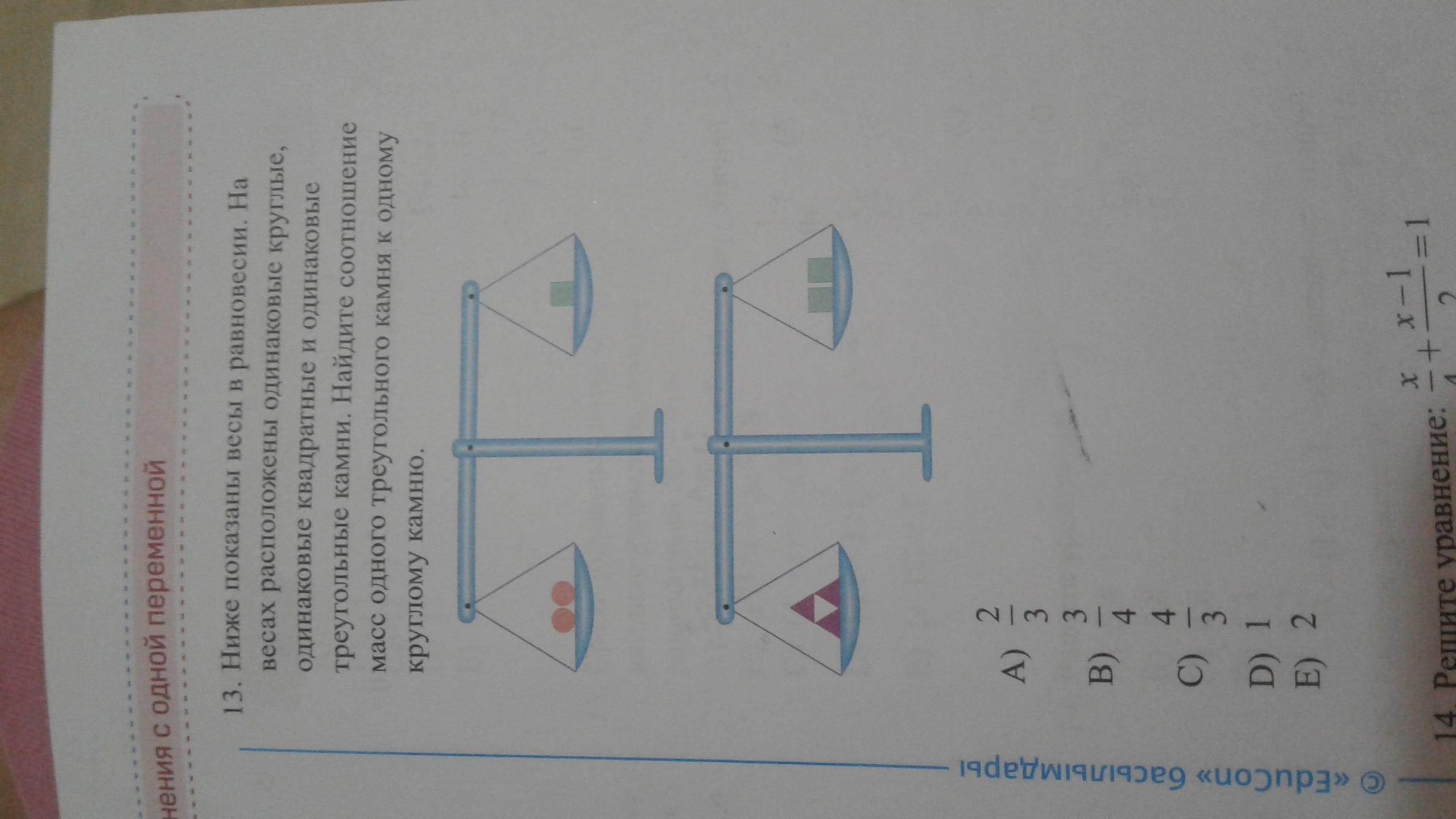 Ниже показаны весы в равновесии. На весах расположены одинаковые круглые, одинаковые квадратные и одинаковые треугольные камни. Найдите соотношение масс одного треугольного камня к одному круглому камню.