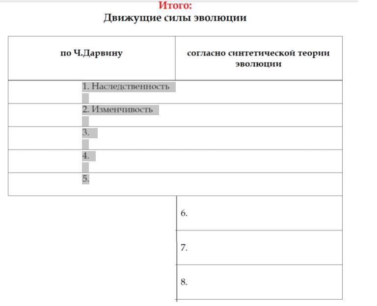 Движущие силы эволюции по Ч. Дарвину: Наследственная изменчивость, борьба за существование (жизненные ресурсы ограничены), все живые организмы обладают способностью к увеличению числинности, естественный отбор (избирательное выживание и размножение наиболее приспособленных особей).