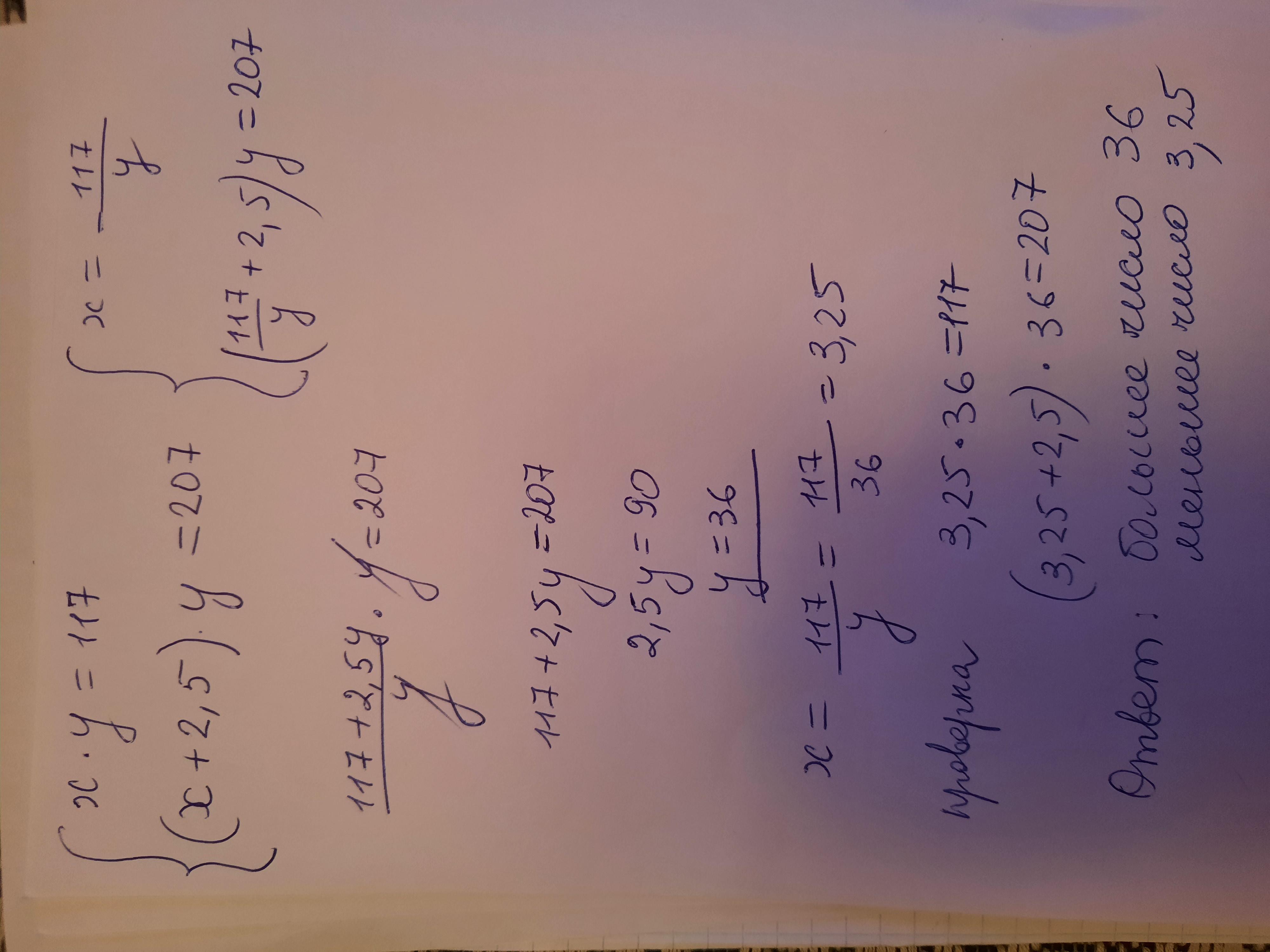 Произведение двух чисел равно 117. Если один из множителей увеличить на 2,5, а другой оставить без изменения, то произведение будет равно 207. Найди эти числа.