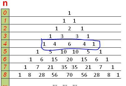 найдем коэффициенты бинома Ньютона из треугольника Паскаля (смотри картинку). Так как у нас 4-я степень, то коэффициенты будут 1,4,6,4,1