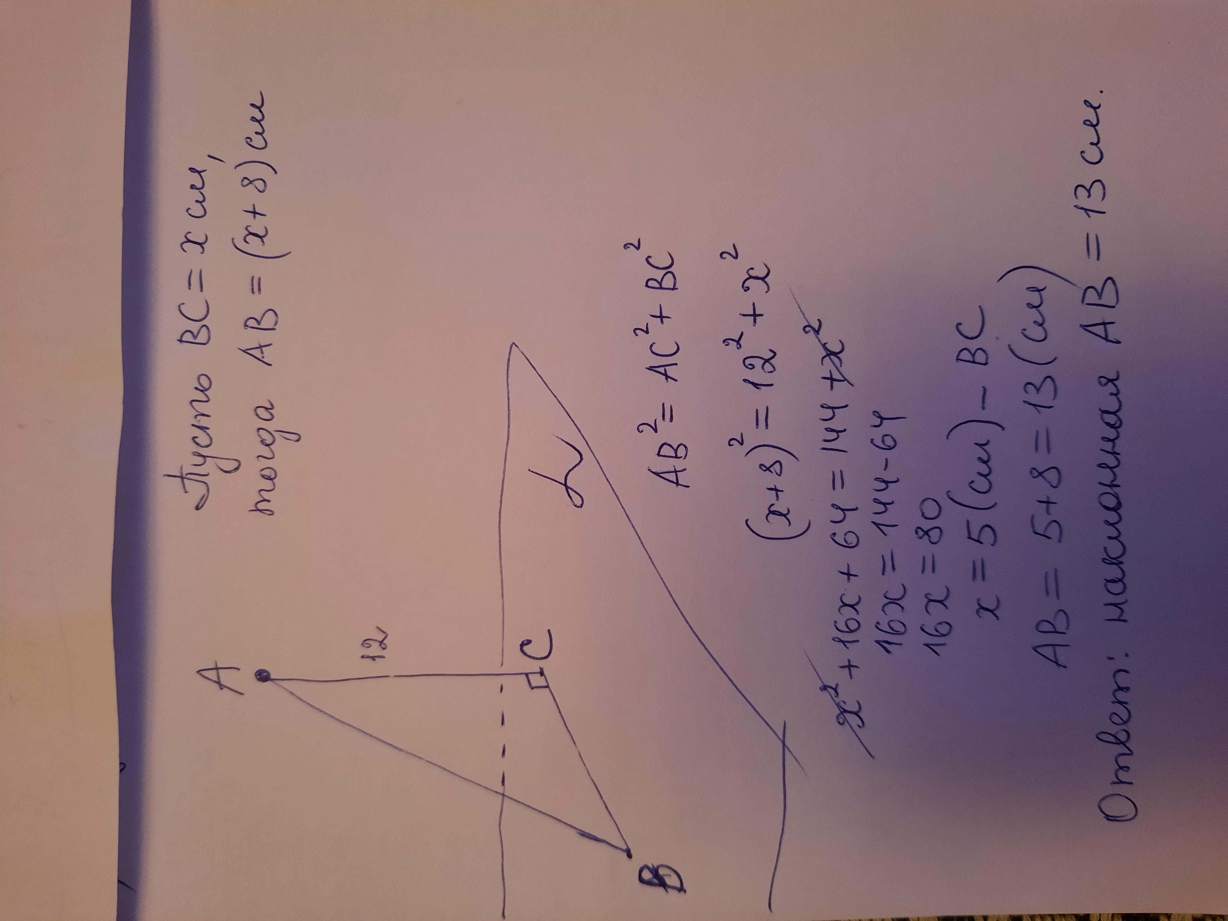 Пусть проекция х. Тогда наклонная (х+8). Уравнение 12²+х²=(х+8)².