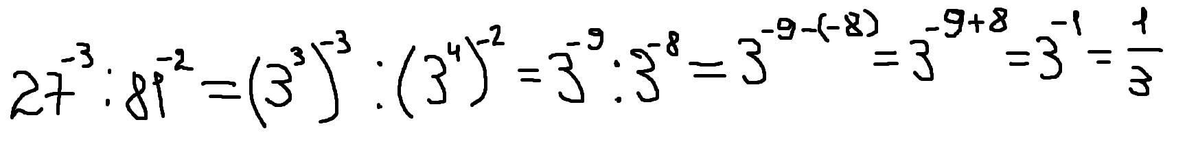 27^-3 : 81^-2 = (3^3)^-3 : (3^4)^-2 = 3^-9 : 3^-8 = 3^-9-(-8) = 3^-1 = 1/3